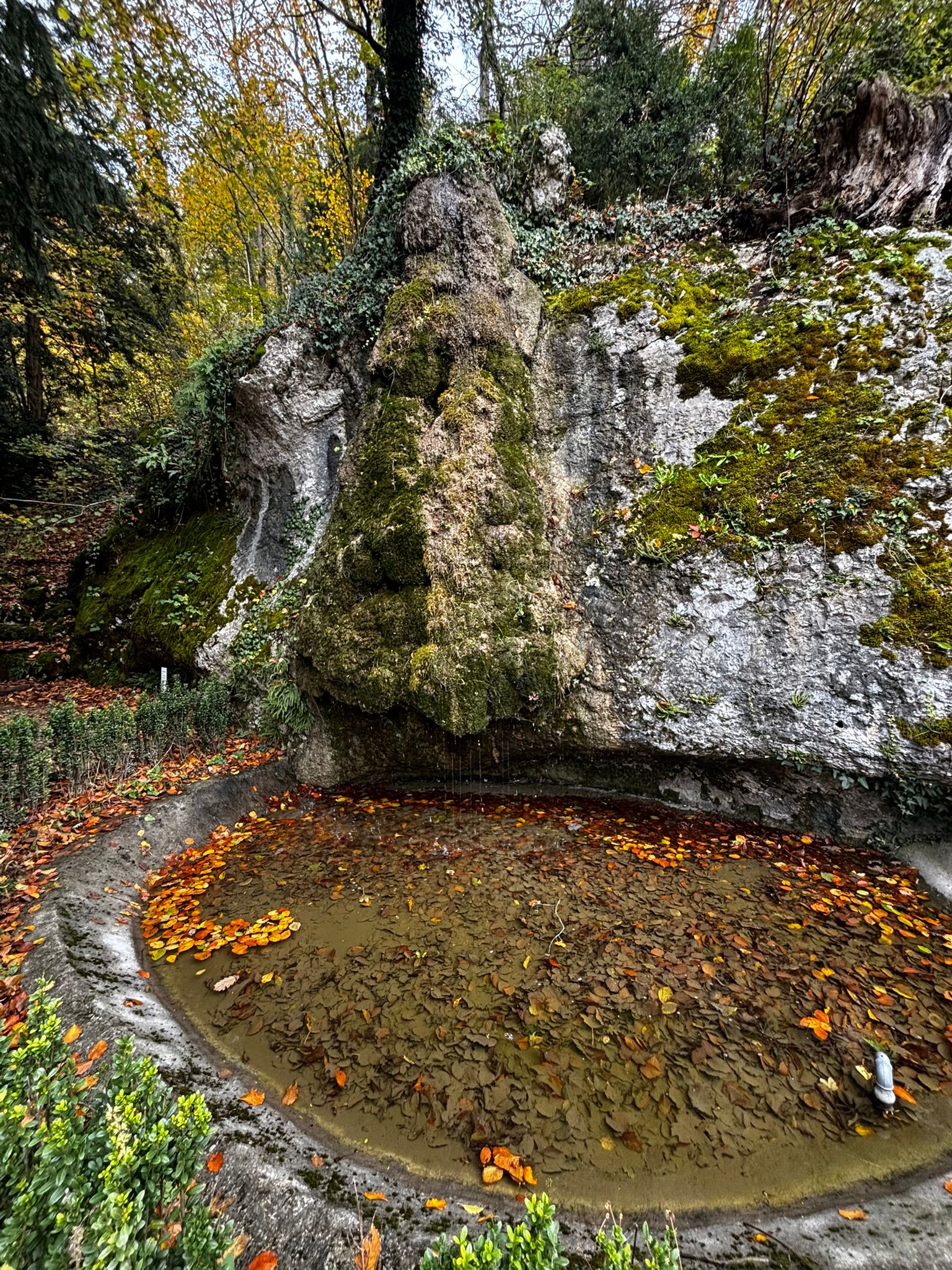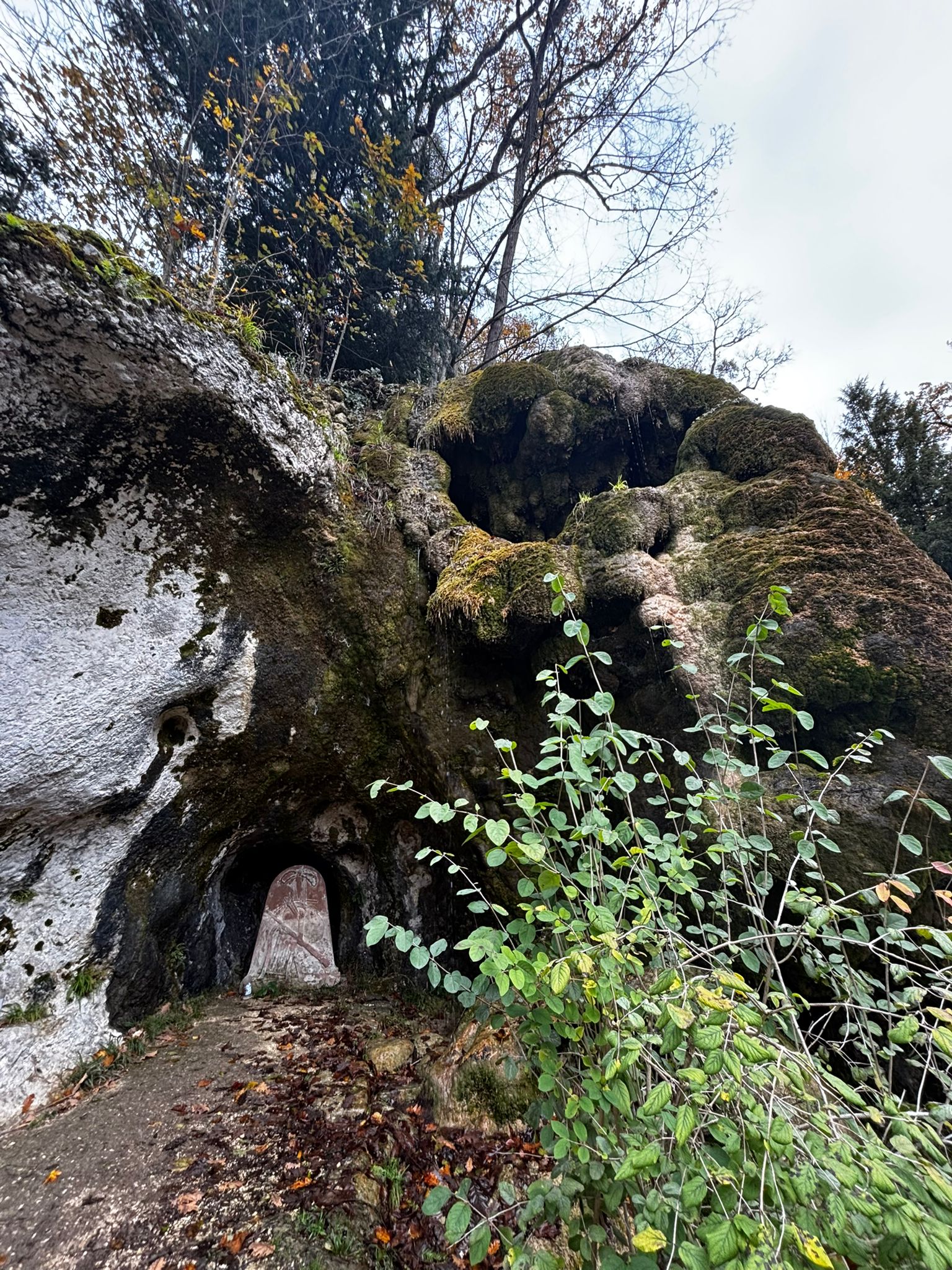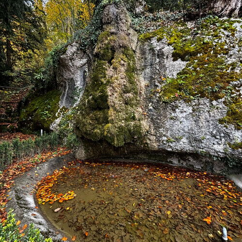 Gestärkt setzten wir unsere Wanderung fort – vorbei an der geheimnisvollen Grotte, der kleinen Waldbruderklause und einem stillen Teich, auf dessen Oberfläche goldene Blätter trieben. Der Weg führte sanft hinunter, auf bequemen Tritten, begleitet vom leisen Rauschen des Bächleins und dem Duft des feuchten Waldes.