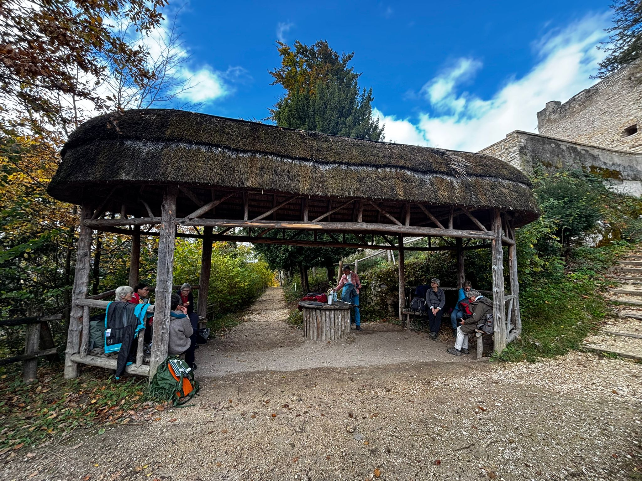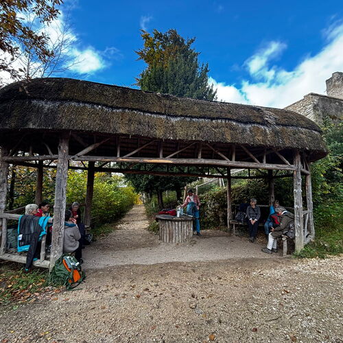 Bald verliessen wir das Dorf und tauchten in den herbstlichen Wald ein. Der Weg führte über sanft ansteigende Naturpfade, vorbei an moosbewachsenen Felsen und buntem Laub, das unter unseren Schritten raschelte. Nach einem angenehmen Aufstieg erreichten wir die Burg Birseck, wo sich ein besonders stimmungsvoller Ort befindet – der Temple Rustique. Hier, im Schutz des hölzernen Pavillons, machten wir unsere Mittagsrast. Bei Brot, Käse, Äpfeln und heissem Tee genossen wir die ruhige Atmosphäre und den weiten Blick über das Tal.